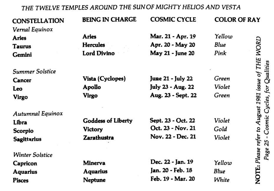 Truly I am grateful for your dedication and your accelerated consciousness, something which must be carefully guarded with constant vigilance! Beloved Vesta and I were considering ways and means to give further assistance to our child (the Earth) and we deemed it wise to draw your attention to the Twelve Temples around us, which actually dwell within our Aura. The majority of you are aware of these Temples... but how much attention do you give them! I request they be brought to your attention at this time, enumerating the astrological sign - the Being in charge - quality and color especially associated with each one, and the period when the specific Gift or Quality is actively accelerated.